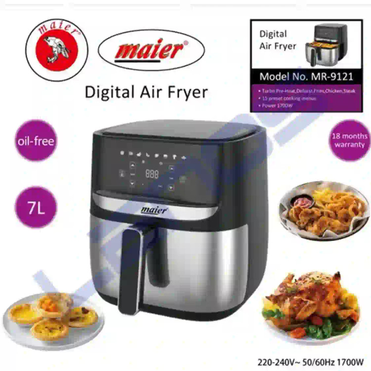 سرخ کن 9121 یک سرخ کن بدون روغن از برند مایر با ظرفیت 7 لیتر و توان 1700 وات است. این دستگاه دارای صفحه نمایش دیجیتال لمسی، 8 برنامه پخت از پیش تعیین شده، قابلیت تنظیم دما (80-200 درجه سانتی گراد) و تایمر است. همچنین دارای قابلیت خاموشی خودکار و سیستم قطع کن است.