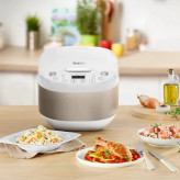 مولتی کوکر RK622130 تفال با تواناییها و عملکردهای خود به شما در انجام بسیاری از فرآیندهای آشپزی یاری میرساند. این محصول دارای توان 750 واتی است که قابلیتهای آرام پز، بخارپز و پخت پلو را برای شما ممکن میسازد. در این دستگاه 12برنامه از پیش تعریف شده و زمانبندی برای شروع پخت با تأخیر تعبیه شده تا در حین کار کردن بهترین نتیجه از عملکرد آن را احساس کنید. شرکت تفال ایمنی شما را در حین پخت و پز تضمین میکند. بدنه عایق سرد و دستگیره برای حمل، کار شما را با این دستگاه آسانتر و از شما در برابر بروز هرگونه حادثه محافظت میکند. پایههای لاستیکی ضدلغزش آن نیز از لق زدن و تکان خوردن در حین کار جلوگیری میکند و موجب حفظ و ثبات بیشتر میشود تا شما با تسلط بیشتری به آشپزی بپردازید. گفتنی است در تولید قطعاتی که با غذا در تماس هستند از ماده شیمیایی خطرناک BPA استفاده نشده است.