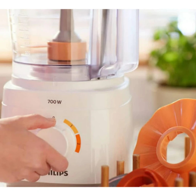 برای نتایج عالی با این محصول، باید رنگ لوازم جانبی را با همان رنگ سرعت تعیین شده روی بدنه مطابقت دهید. از سرعت 1 برای همزدن خامه، همزدن تخم مرغ، درست کردن خمیر استفاده کنید و سرعت 2 برای خرد کردن پیاز و گوشت چرخ کرده ایده آل است. همچنین غذاساز PHILIPS HR7310 مجهز به عملکرد پالس برای استفاده از حداکثر قدرت دستگاه است. غذاساز با طراحی جمع و جور، فضای کمتری را اشغال می کند و تمام لوازم ضروری آن را می توانید به راحتی در داخل کاسه نگهداری کنید.